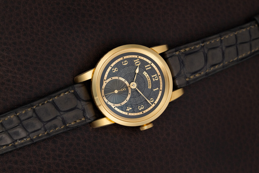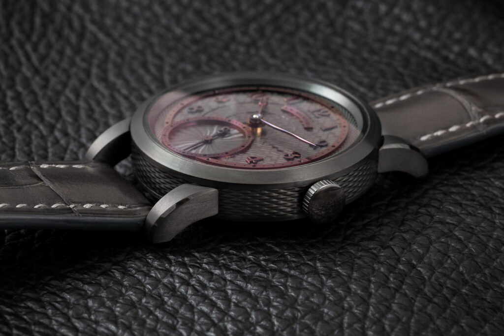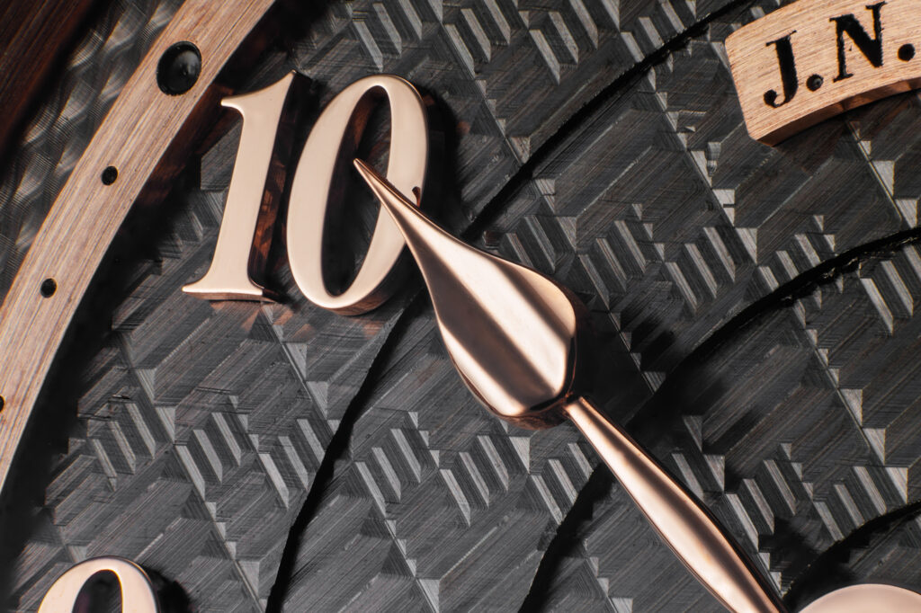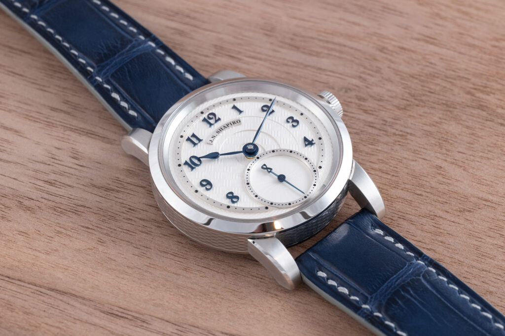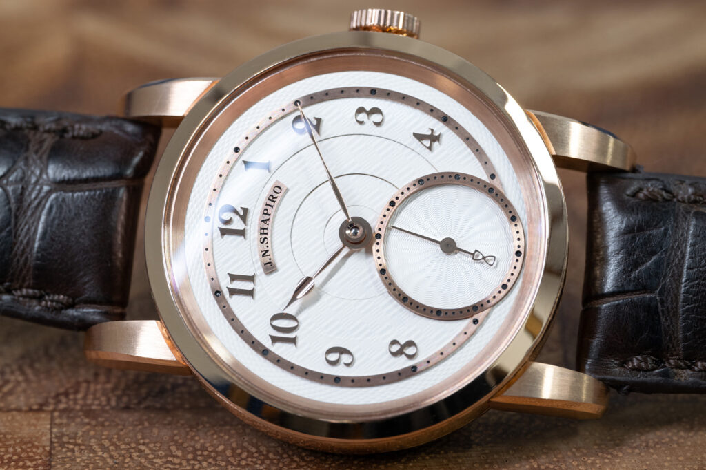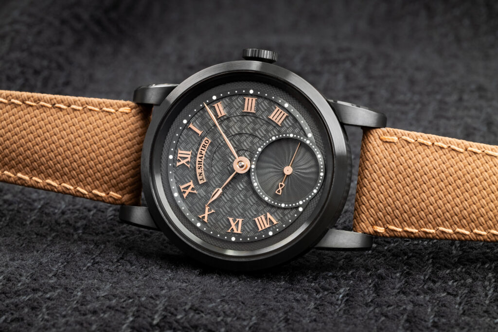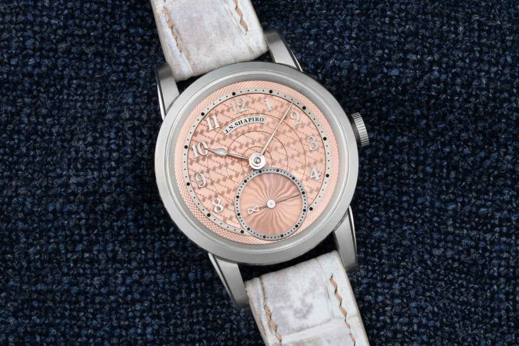 The J.N. Shapiro Resurgence features a multi-layered dial in customizable colors. It comprises separately engine-turned sectors that showcase multiple patterns, including barleycorn and Shapiro’s distinctive Infinity weave. Each layer is a different piece of metal, engine-turned separately, trimmed and painstakingly milled for a perfect fit.