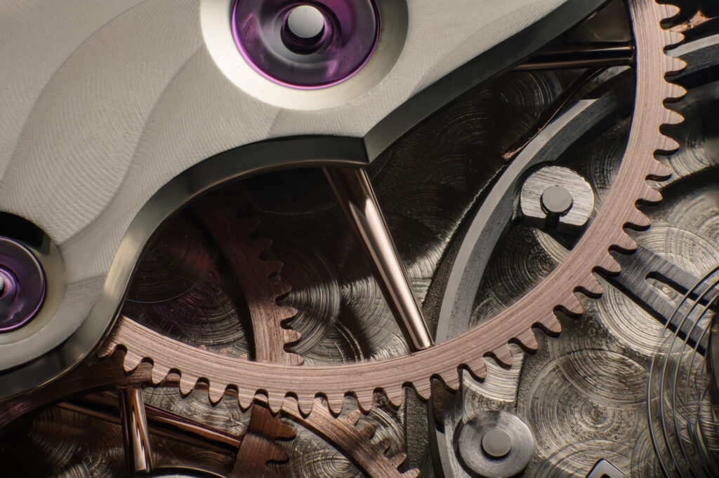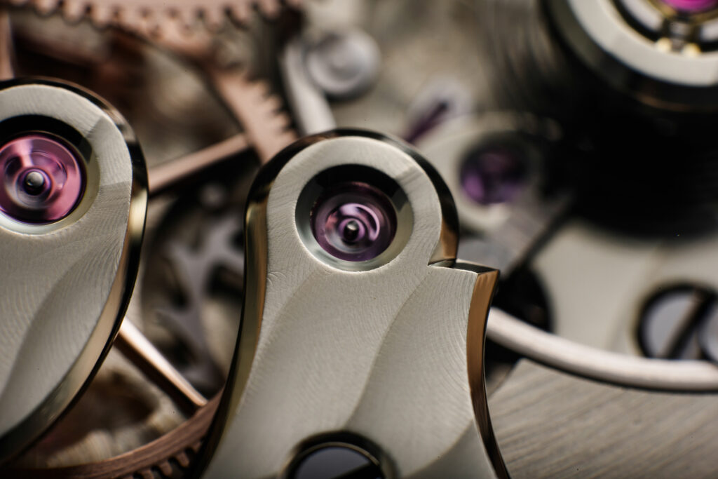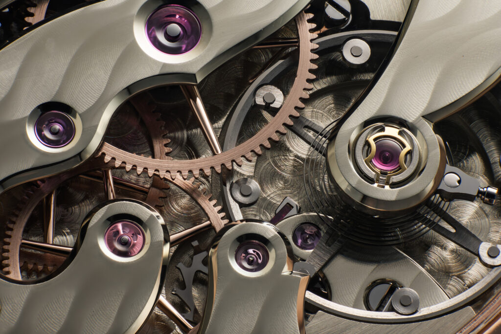 J.N.Shapiro has also gone all out on the anglage (chamfering), especially emphasizing internal angles. The wheels in the movement are 14k rose gold, with rounded and polished spokes.