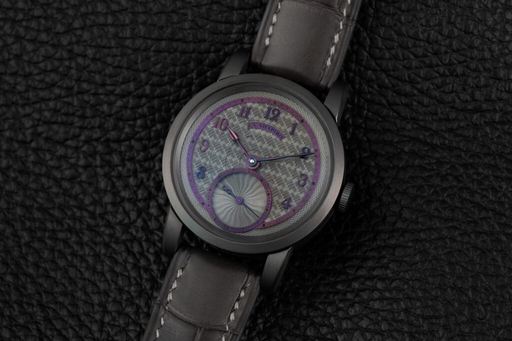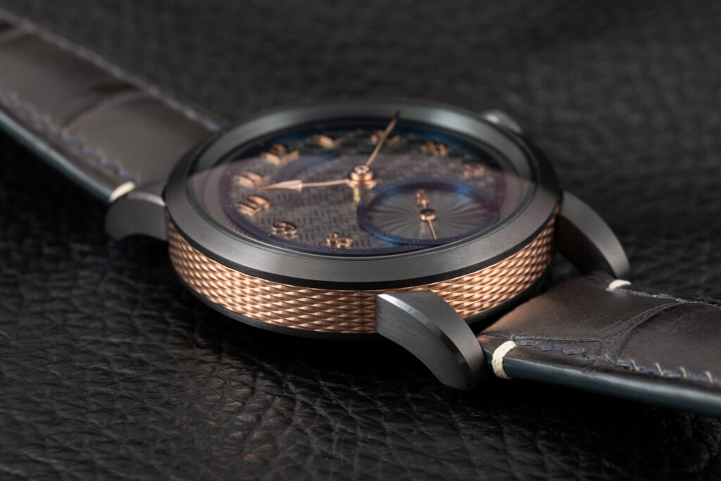 The subdial is decorated with a miniaturized moiré pattern usually reserved for the complete dial. Every numeral is individually machined and black polished.